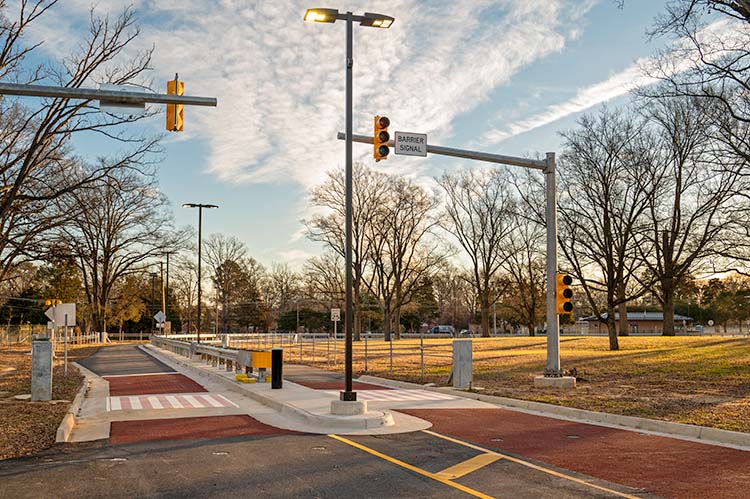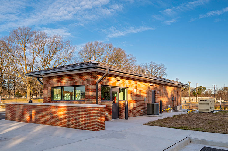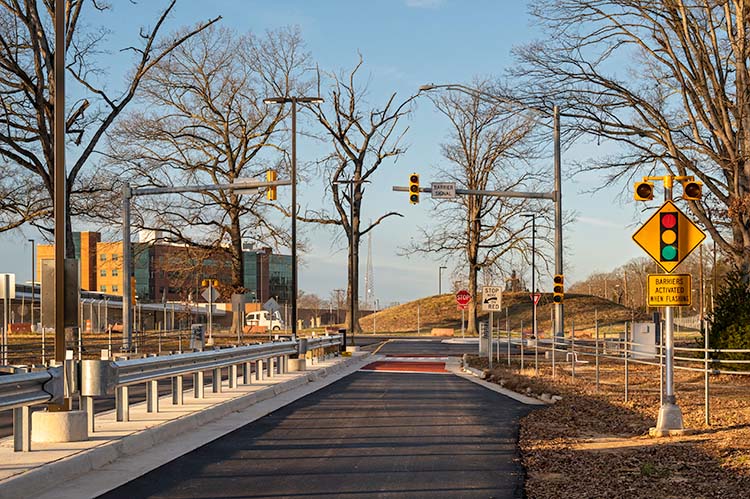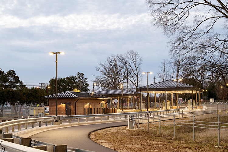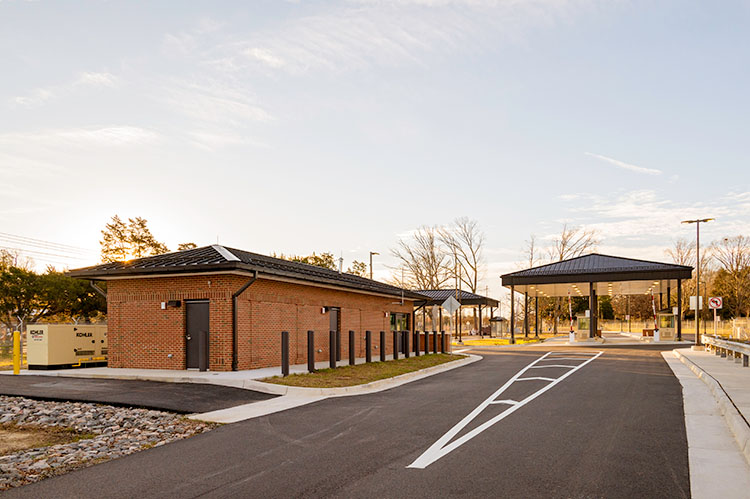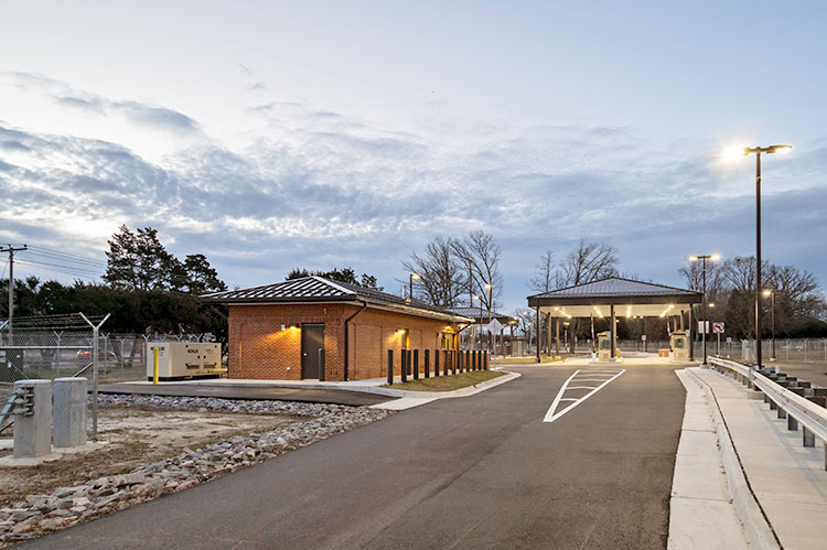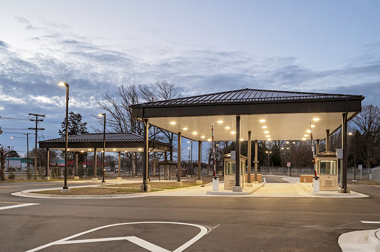 This five-acre, US Army Corps of Engineers project includes a new gate house, two bullet resistant guard booths, two steel covered inspection canopies, a vehicle search area shelter, new two-lane entrance and roadways, parking, lighting, traffic control signals, security fencing, passive, and active vehicle barriers with comprehensive control systems.